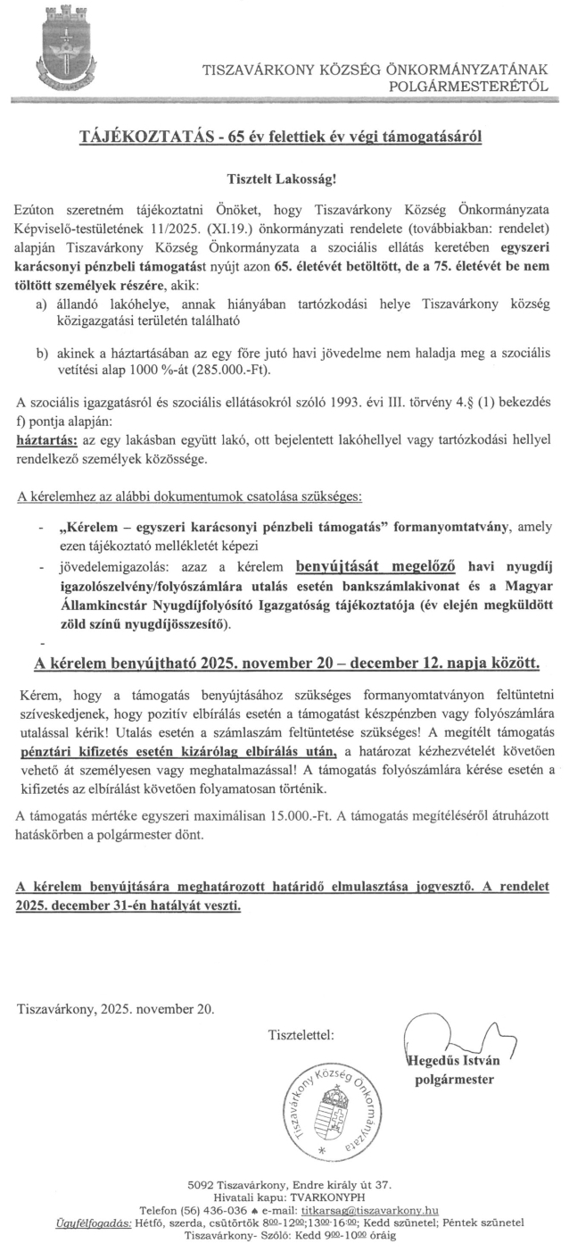 TÁJÉKOZTATÁS – 65 év felettiek év végi támogatásáról